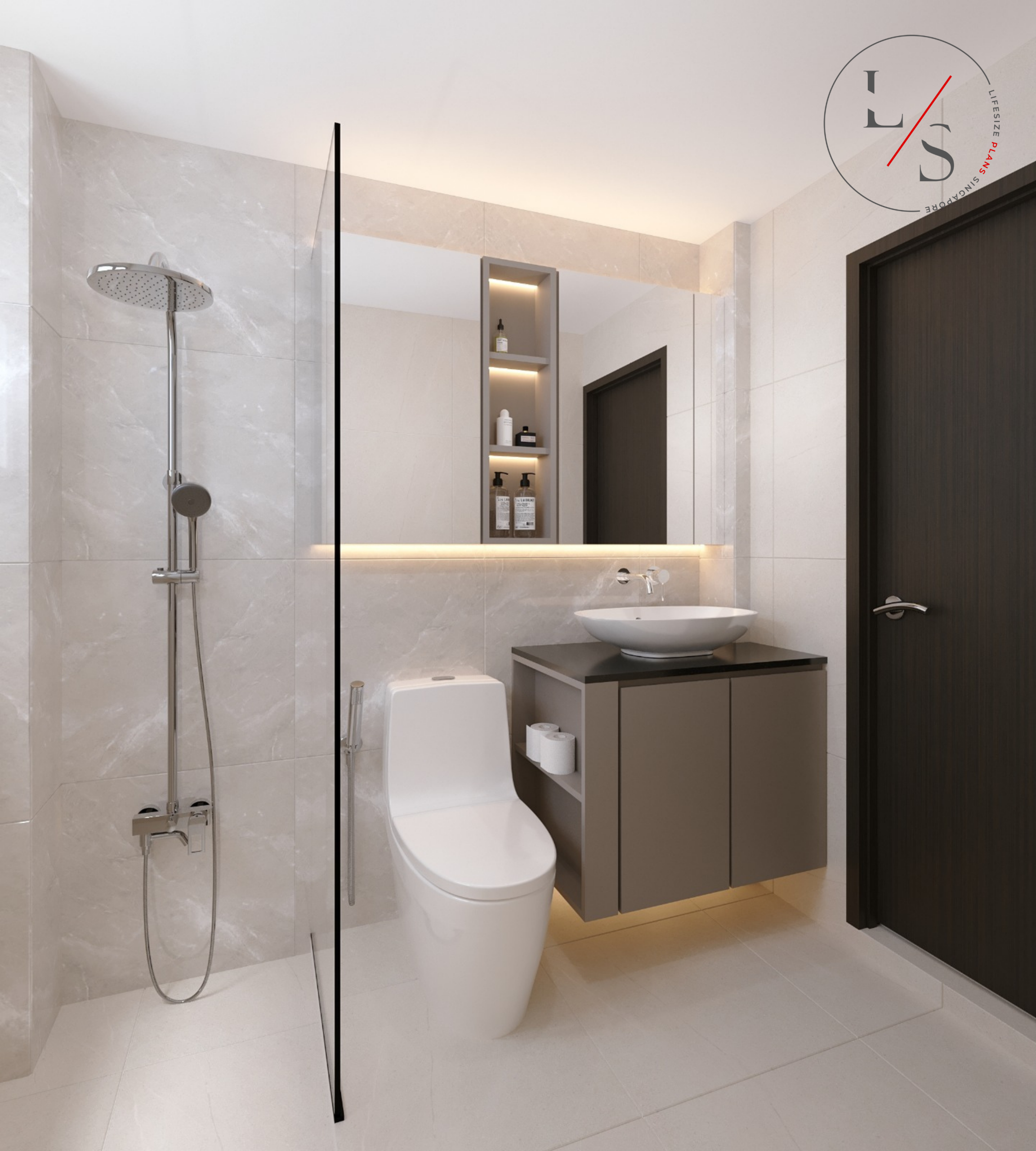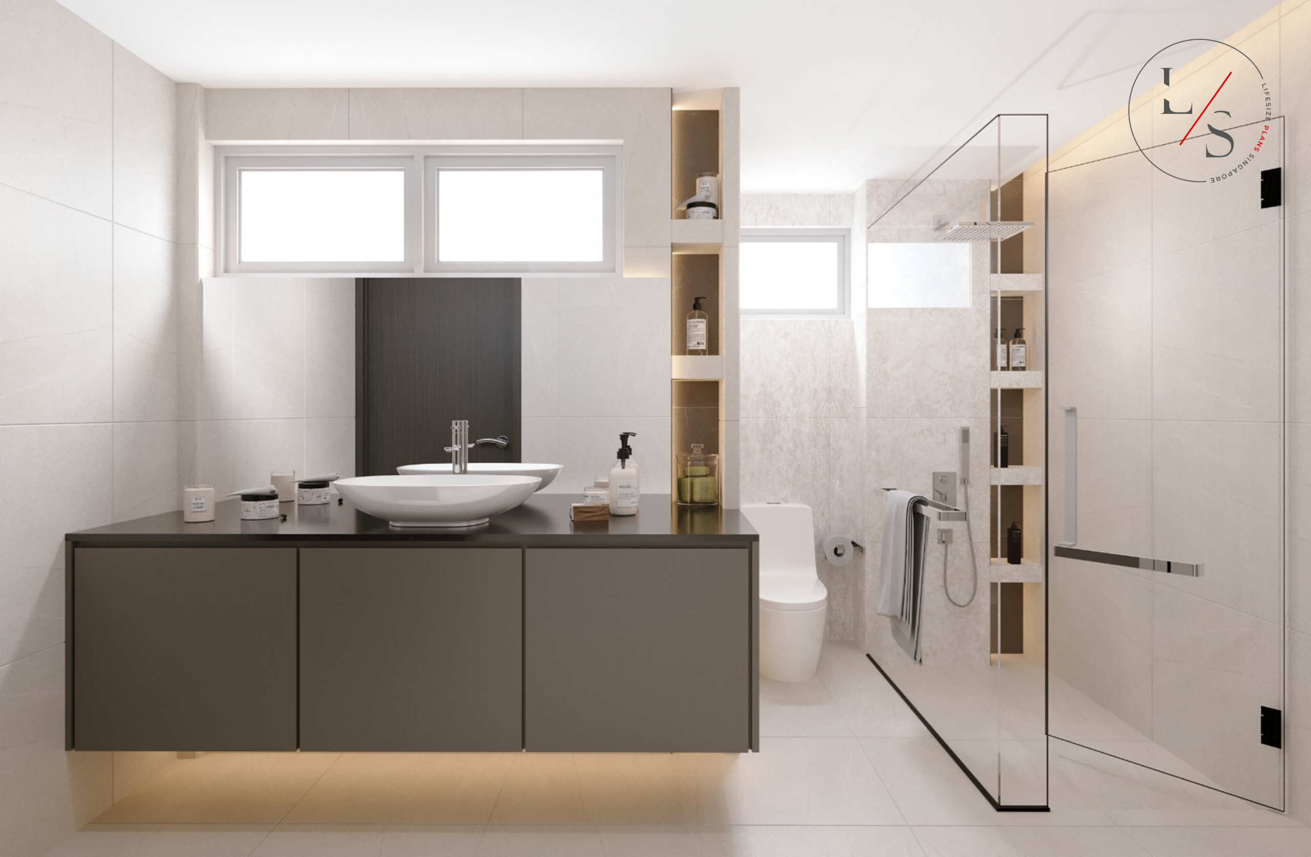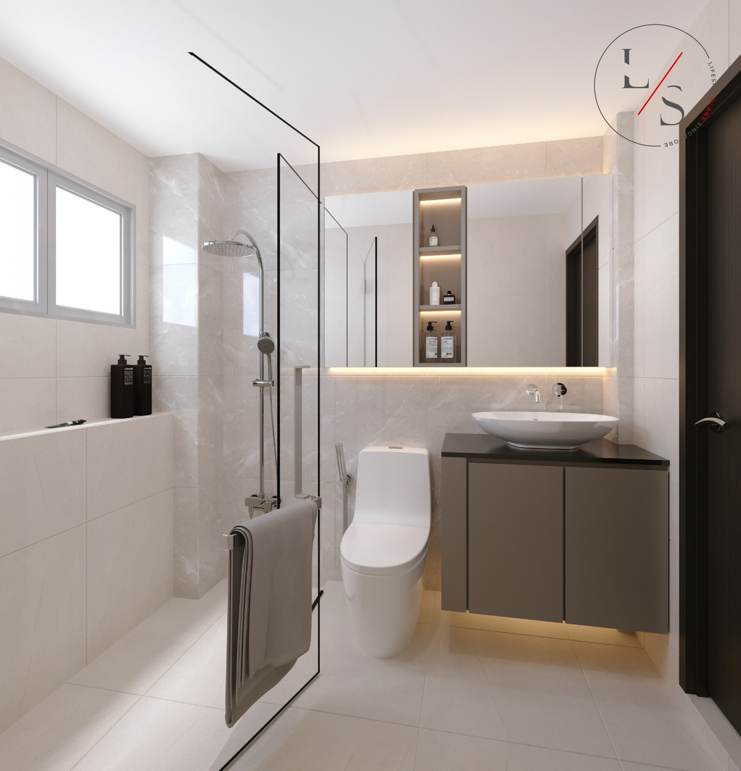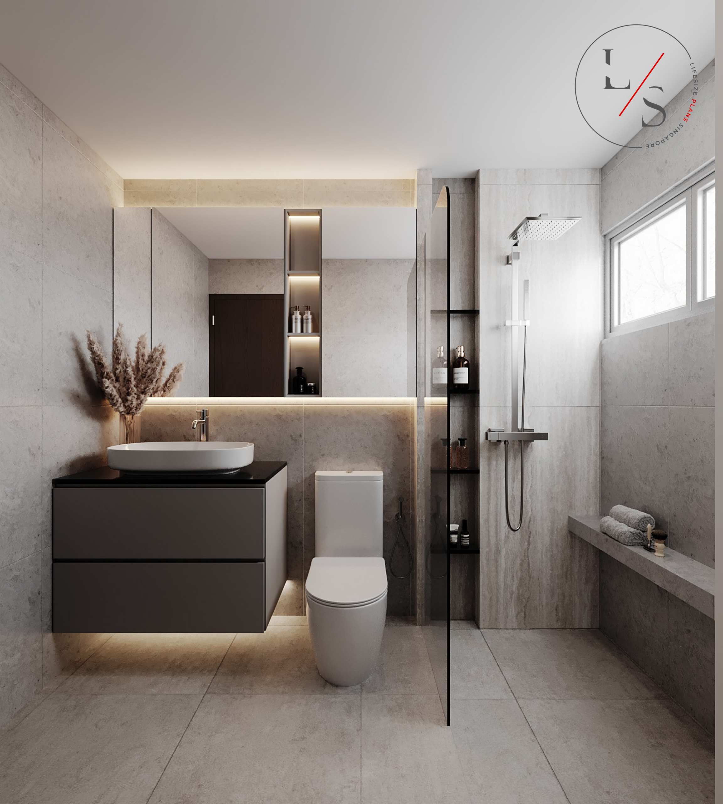 A custom shelving unit with warm recessed lighting not only enhances storage but also introduces ambient illumination that softens the room’s clean lines. The shower enclosure’s slim glass frame maintains openness, allowing natural light to flow freely across the space.