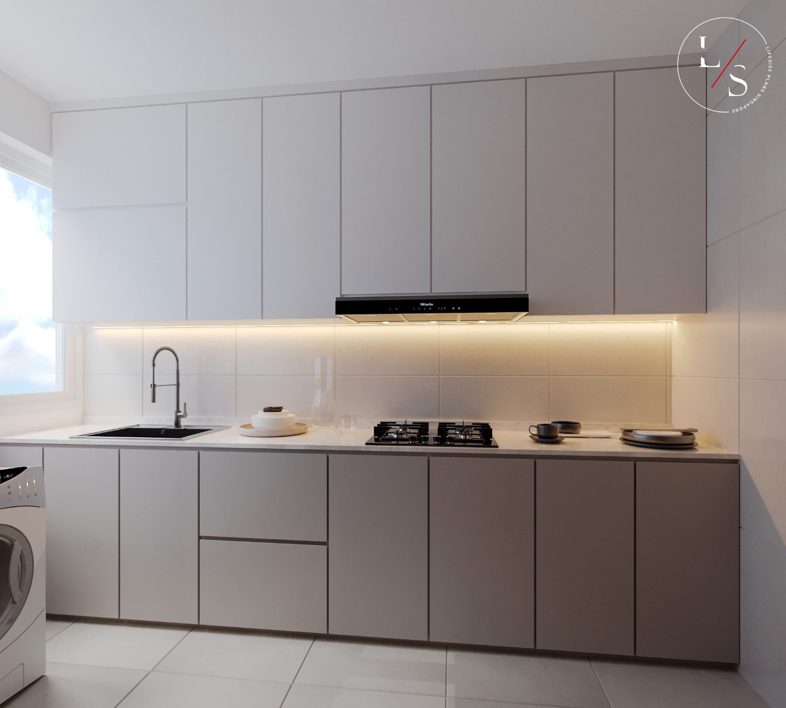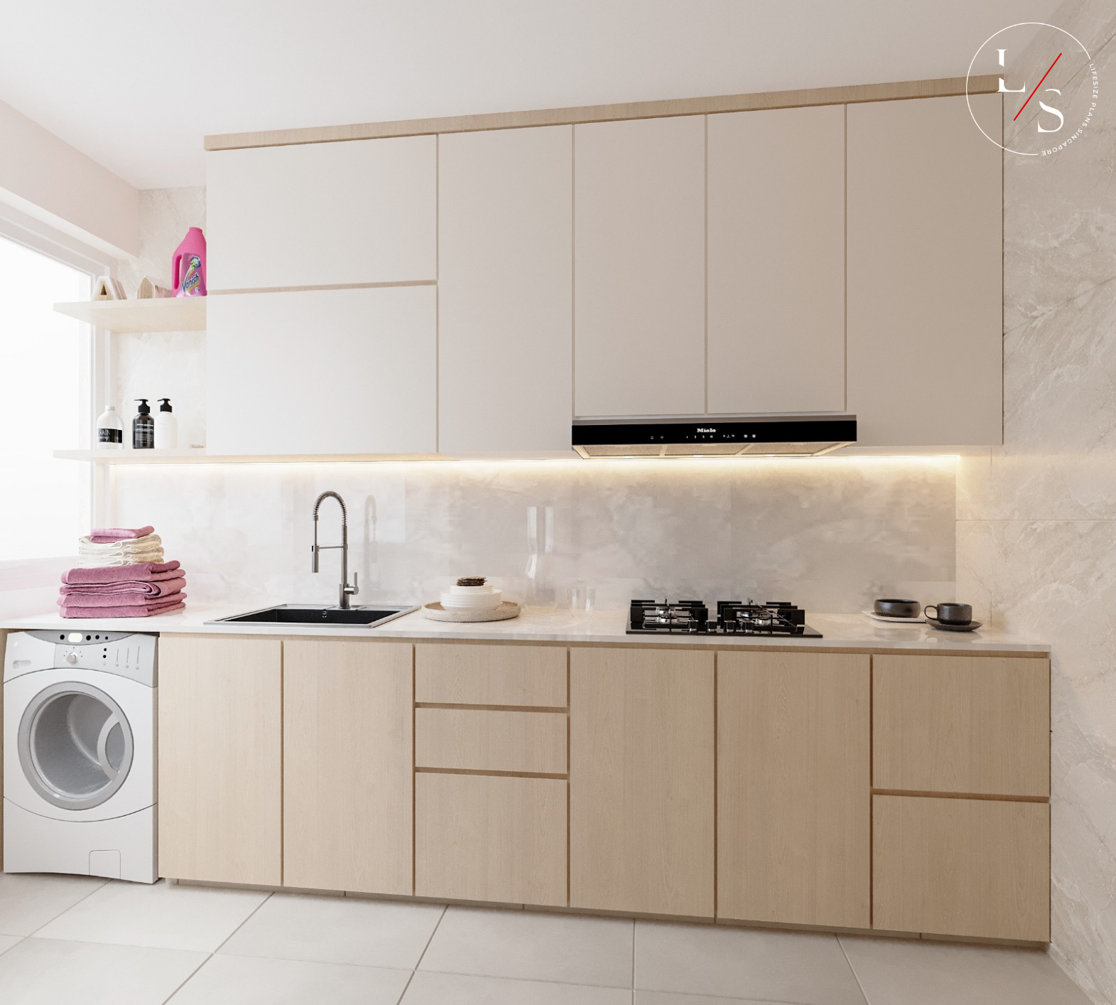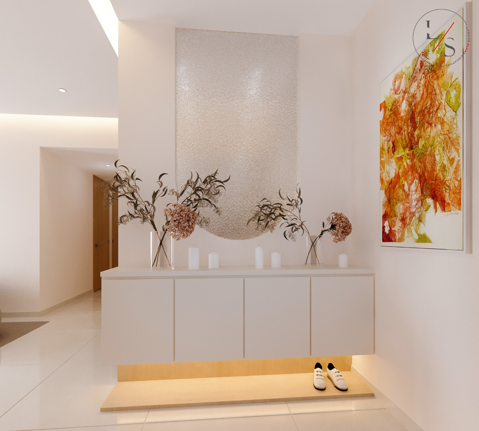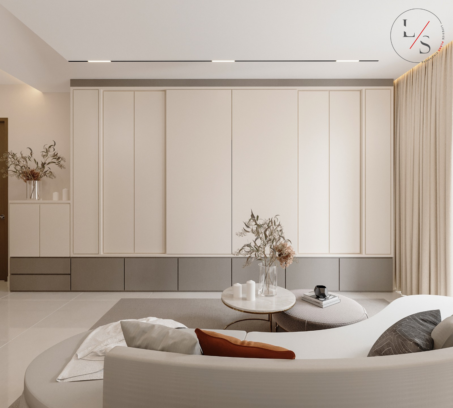 This Sol Acres residence embraces a soothing minimalist palette, where soft beige hues, curved wall panels, and warm cove lighting come together to create a deeply comforting atmosphere. The feature wall becomes the focal point of the home — a sculptural combination of arched panels and illuminated display niches that blend functionality with modern elegance.