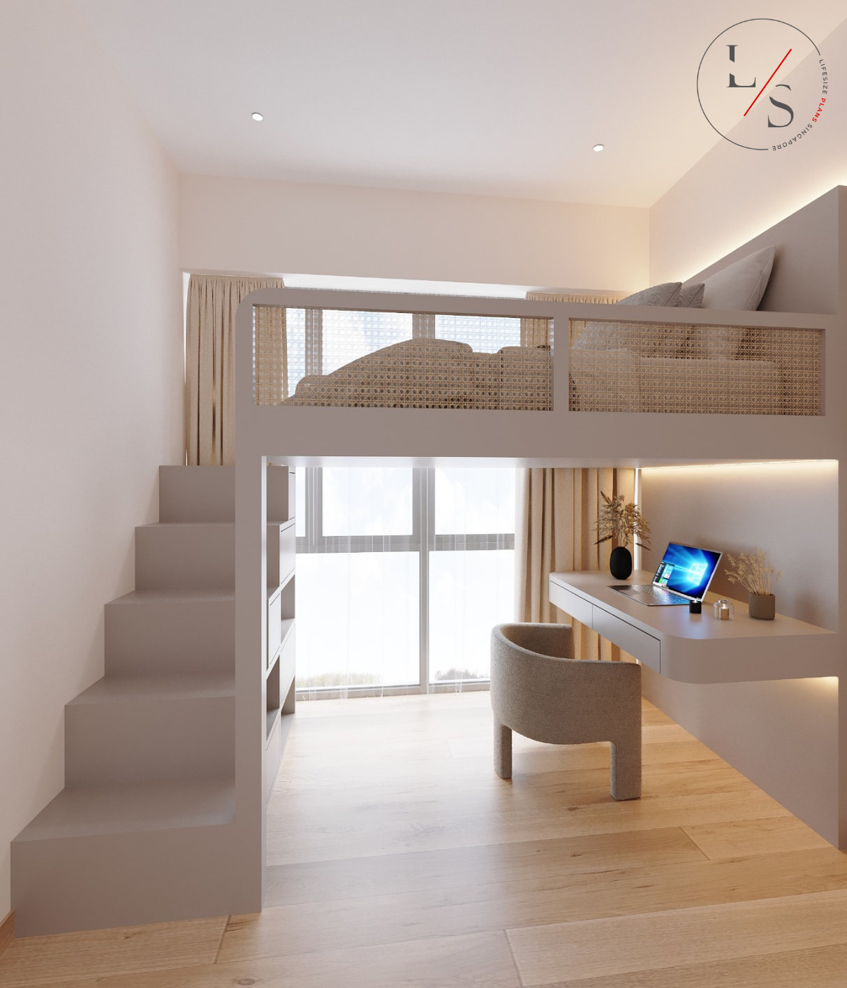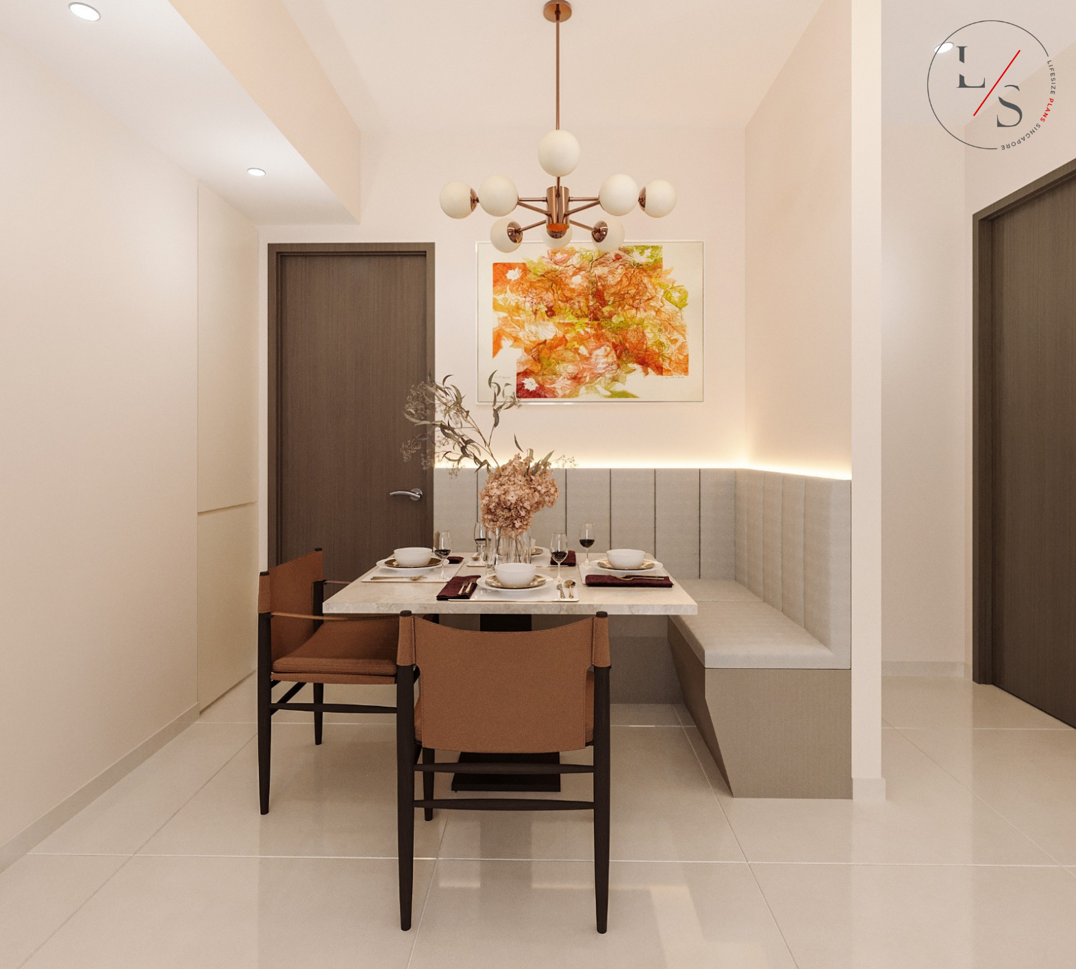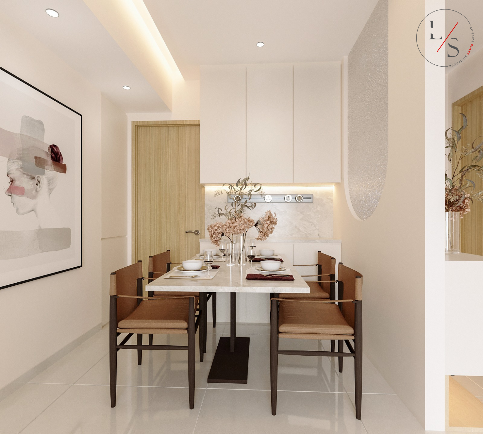 The living area is styled with a round marble coffee table, plush seating, and warm wood accents, bringing together the perfect balance of sophistication and homeliness. This design offers residents a tranquil sanctuary — understated, inviting, and beautifully timeless.