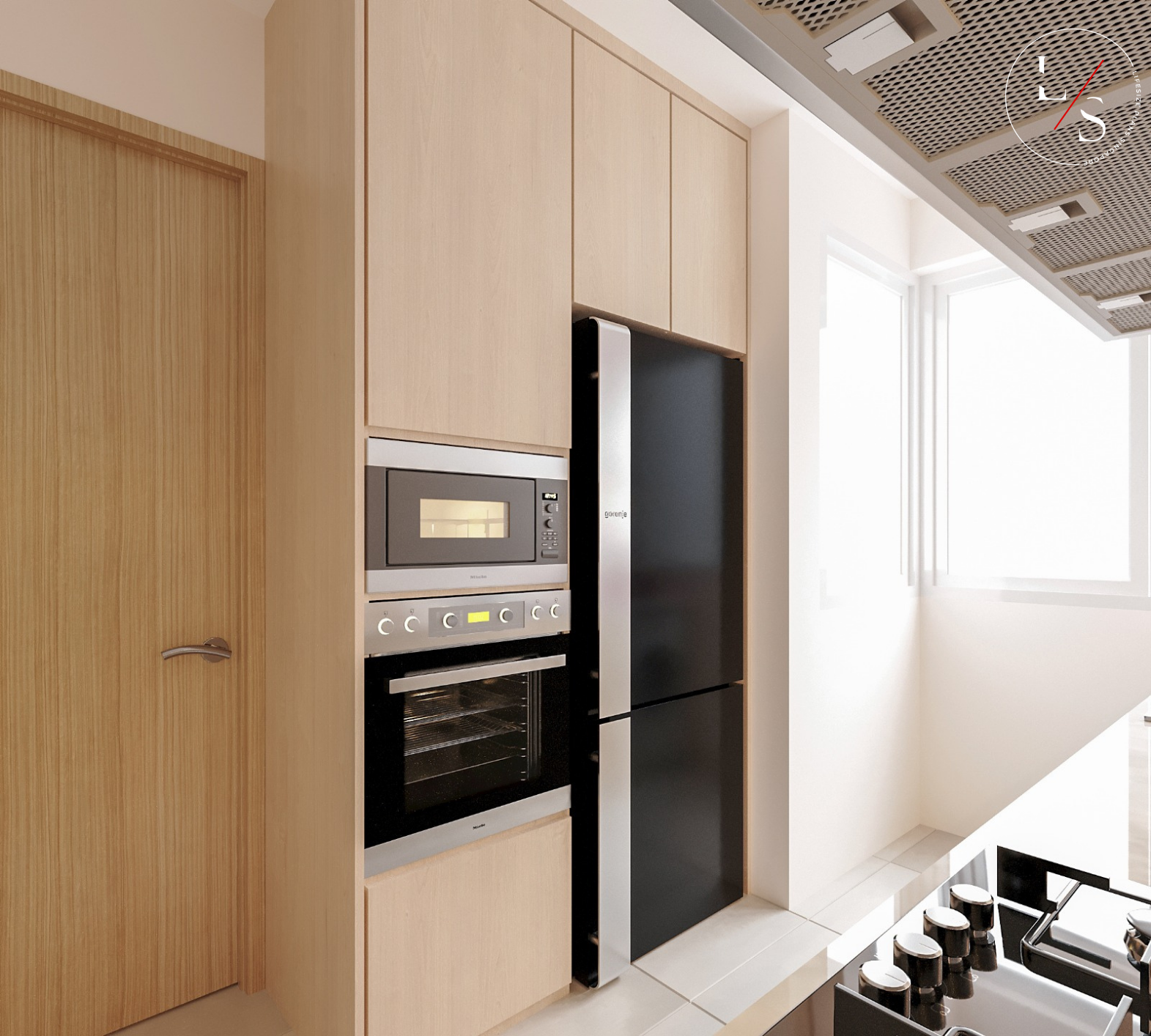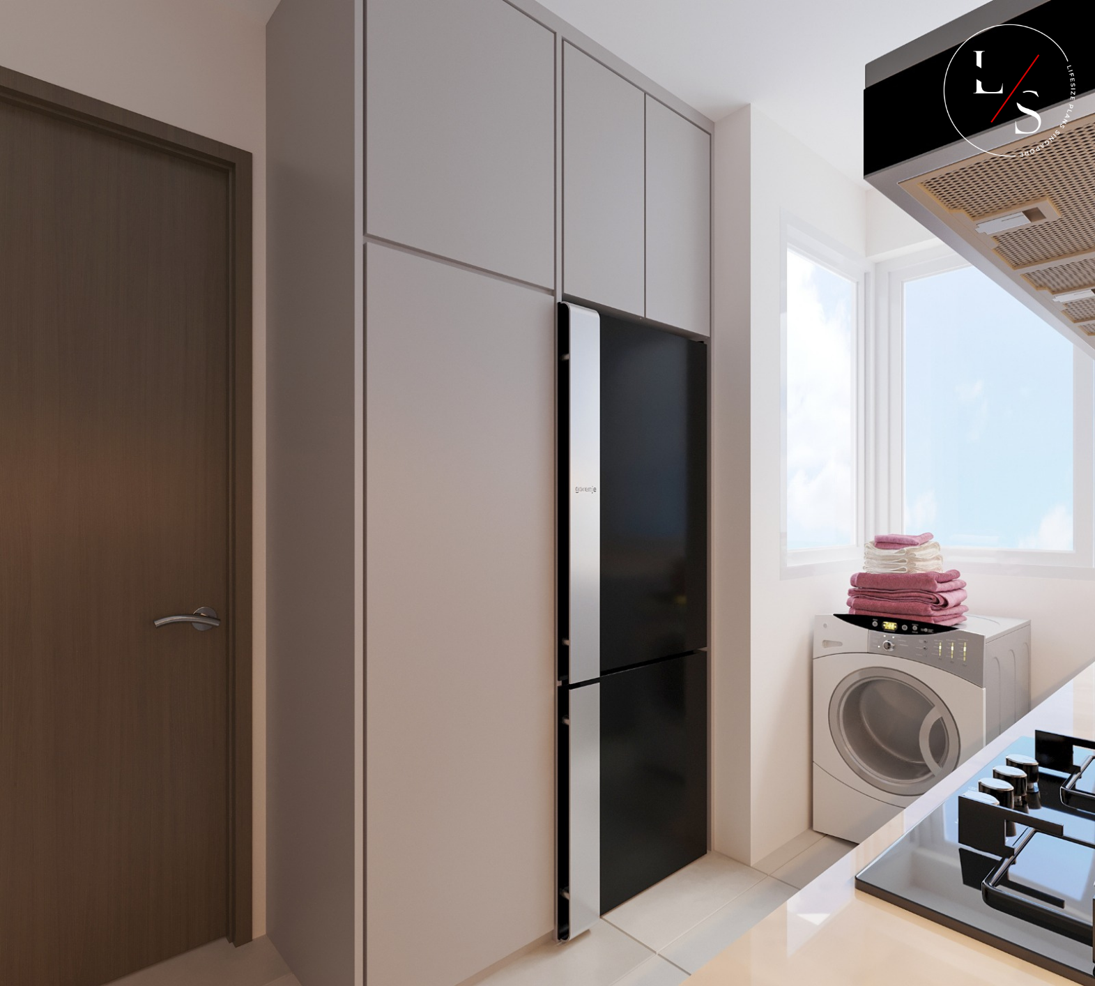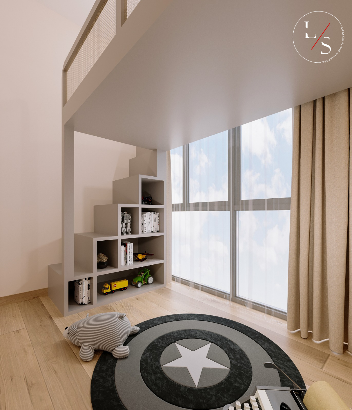 The living area is styled with a round marble coffee table, plush seating, and warm wood accents, bringing together the perfect balance of sophistication and homeliness. This design offers residents a tranquil sanctuary — understated, inviting, and beautifully timeless.