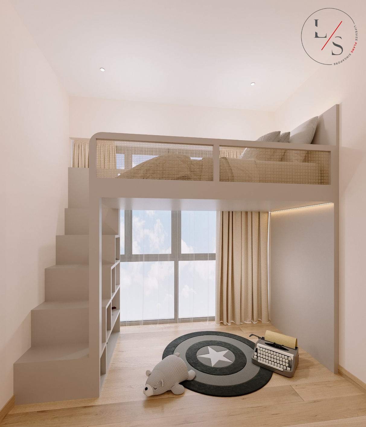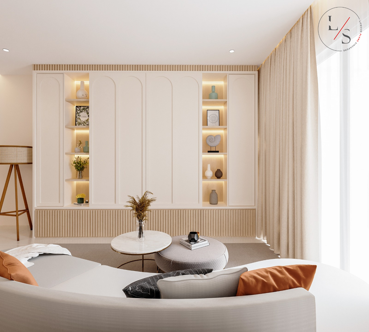 Each niche is thoughtfully lit to highlight curated décor pieces, adding subtle layers of depth and warmth. Below the cabinetry, ribbed detailing introduces texture while keeping the design grounded and tactile. Floor-length drapery softens natural light, bathing the living space in a gentle glow that enhances the room’s airy ambiance.
