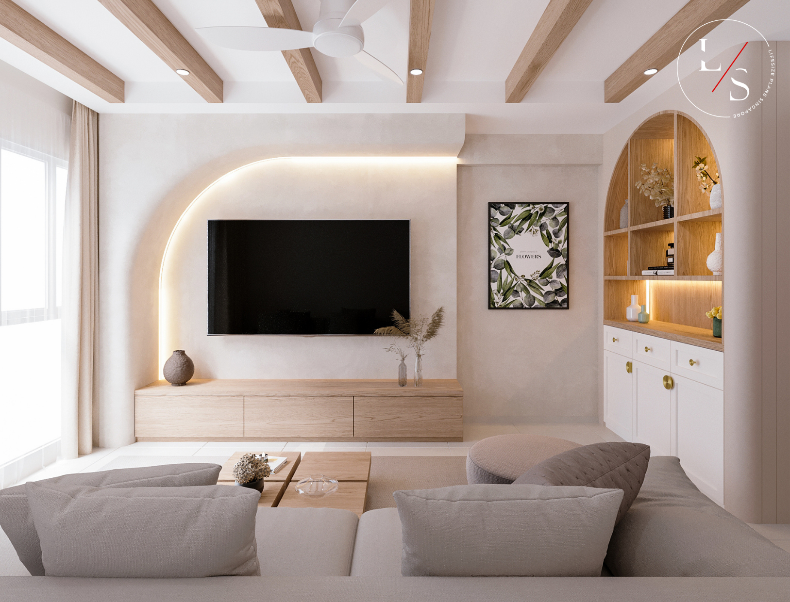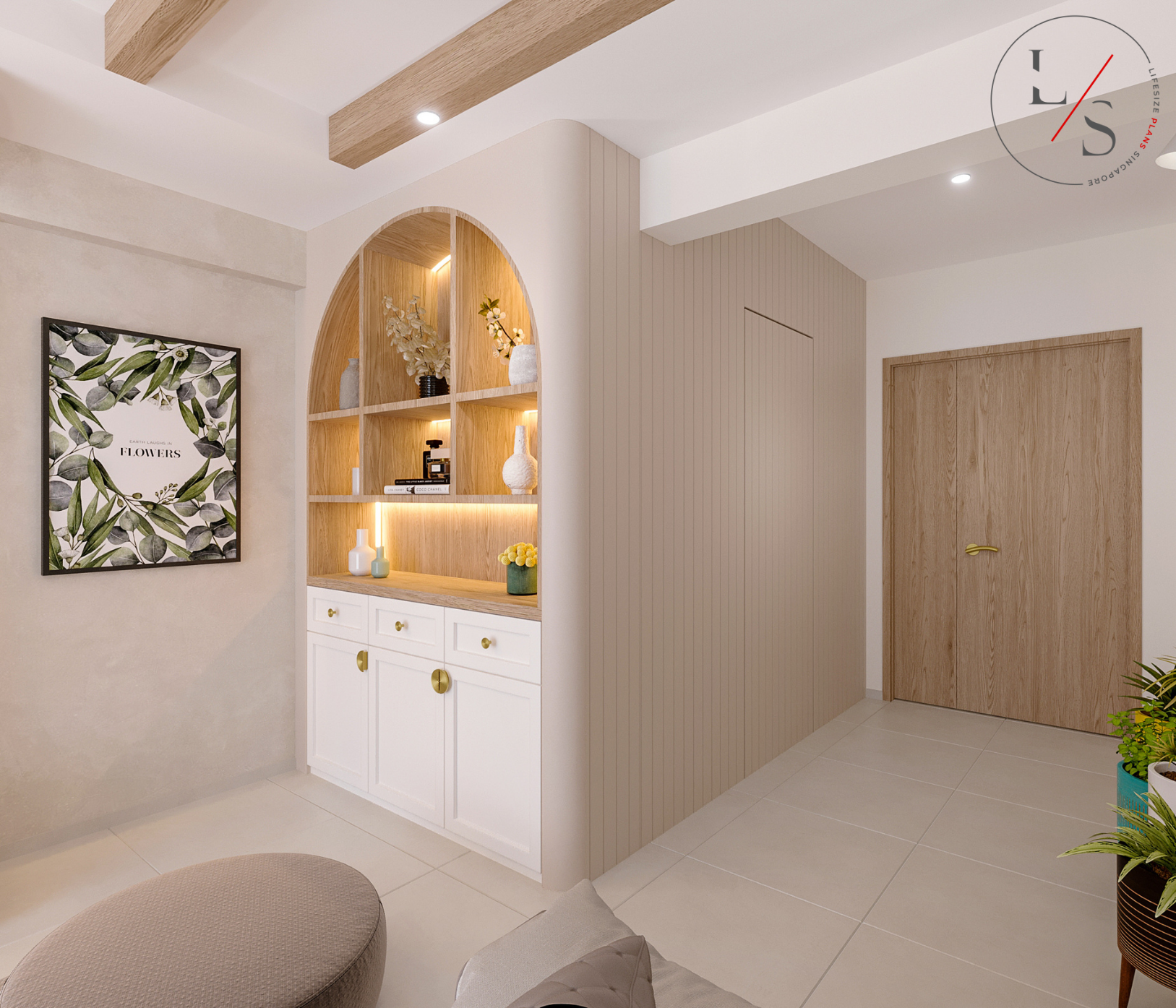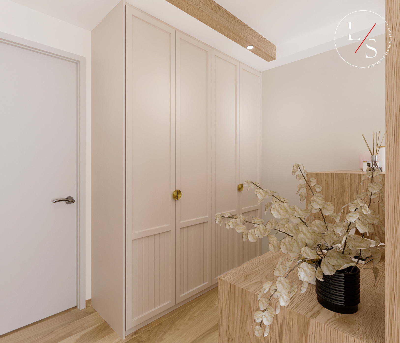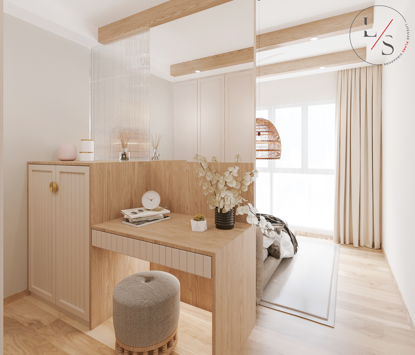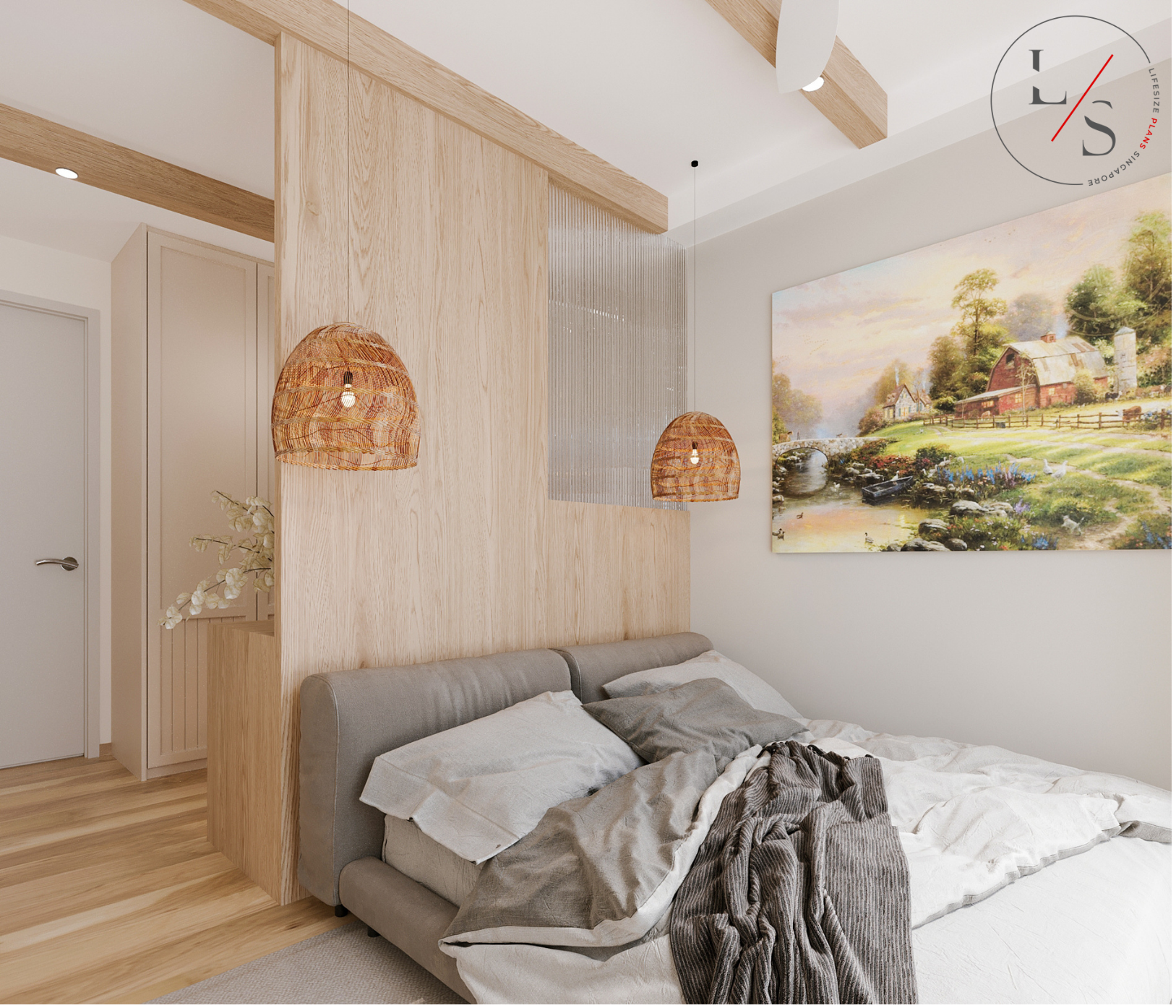 This bedroom marries natural wood tones with soft minimalist lines to create a soothing retreat. A wood-panelled feature wall with a delicate glass panel brings warmth and dimension, gently separating the sleeping area while maintaining openness.