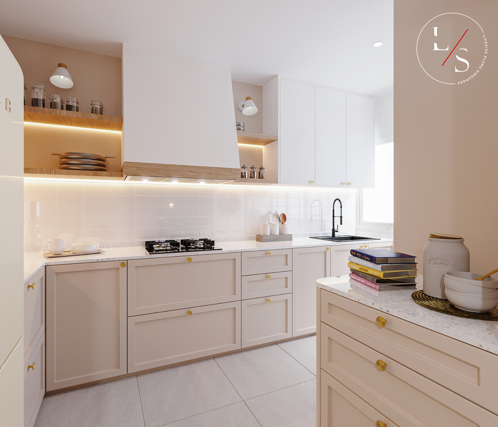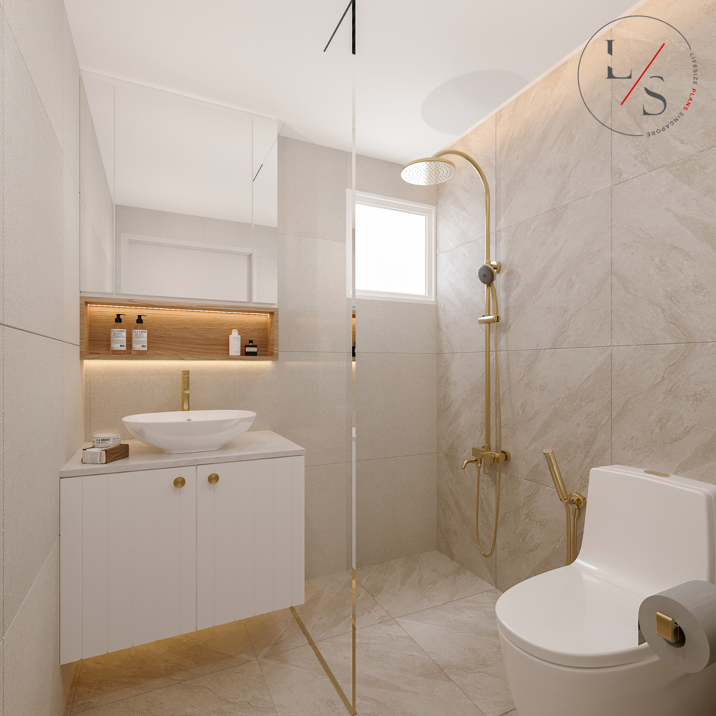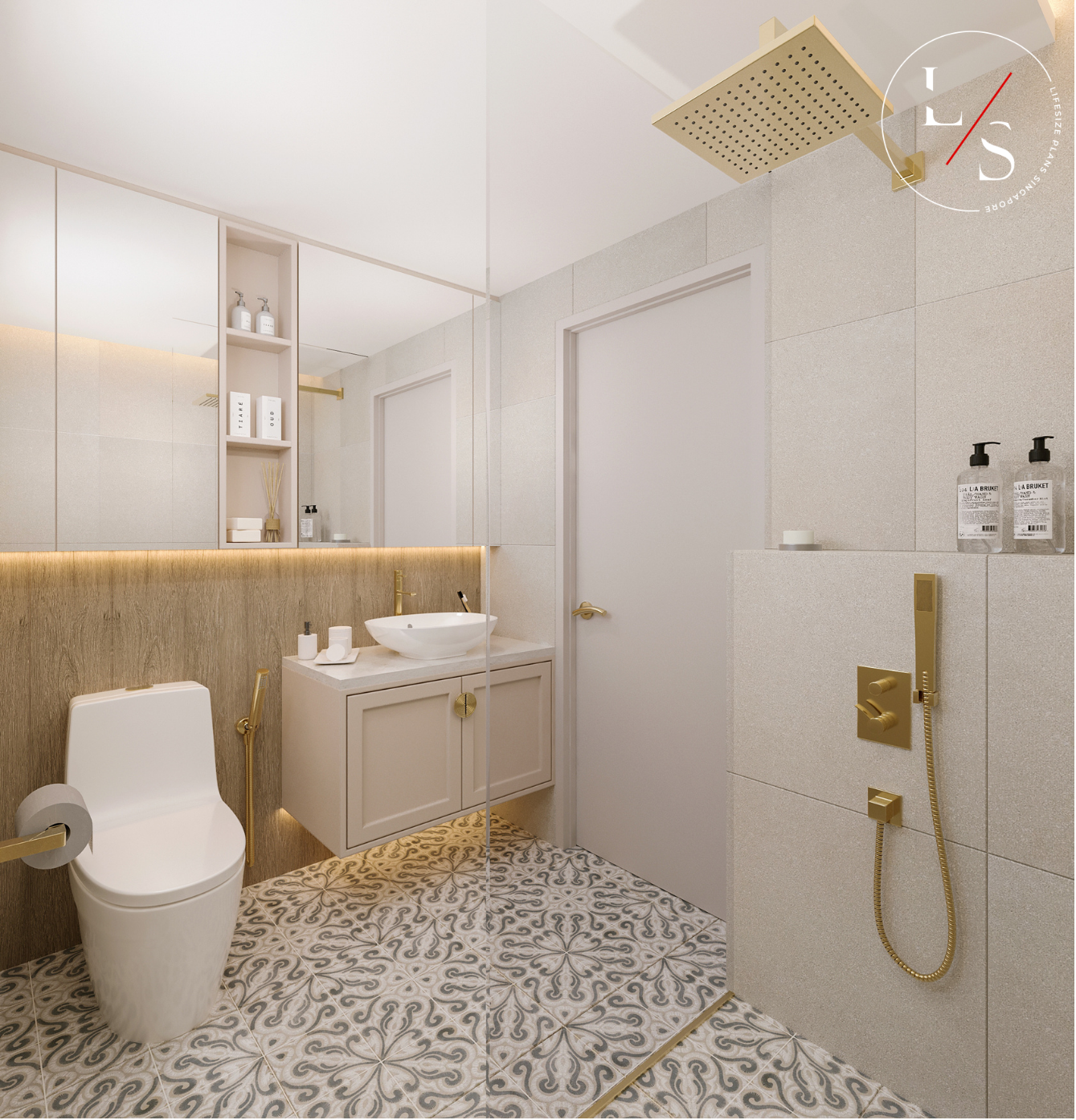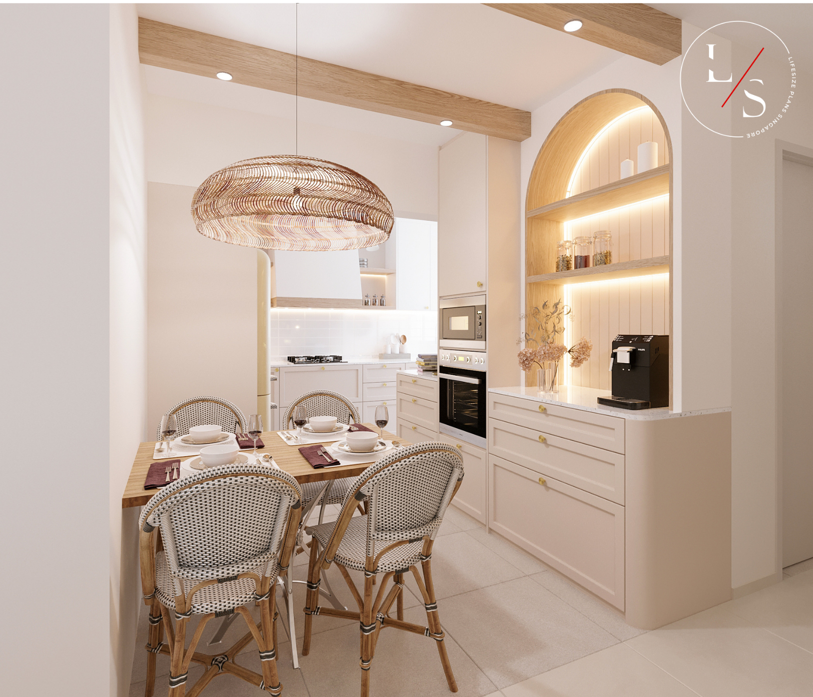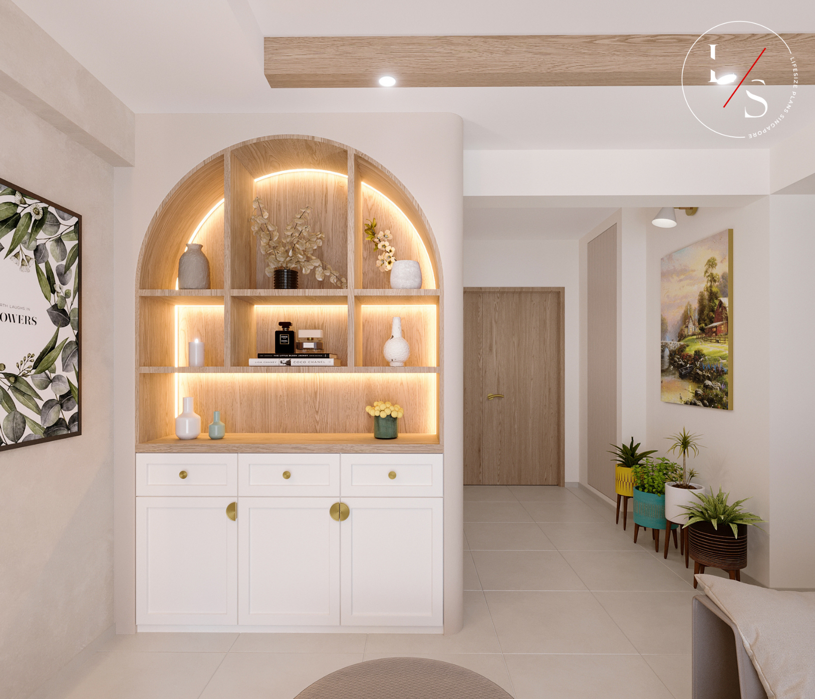 This bedroom marries natural wood tones with soft minimalist lines to create a soothing retreat. A wood-panelled feature wall with a delicate glass panel brings warmth and dimension, gently separating the sleeping area while maintaining openness.