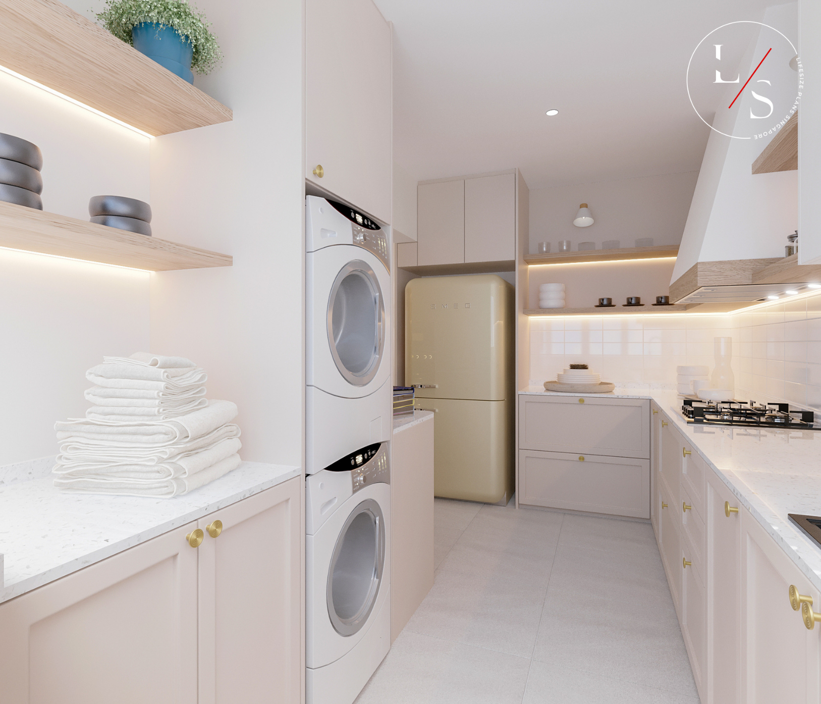 A large landscape artwork introduces a subtle burst of colour, grounding the room in nature and adding visual interest without overwhelming the design. This bedroom embodies a peaceful, balanced lifestyle — warm, grounding, and beautifully serene.