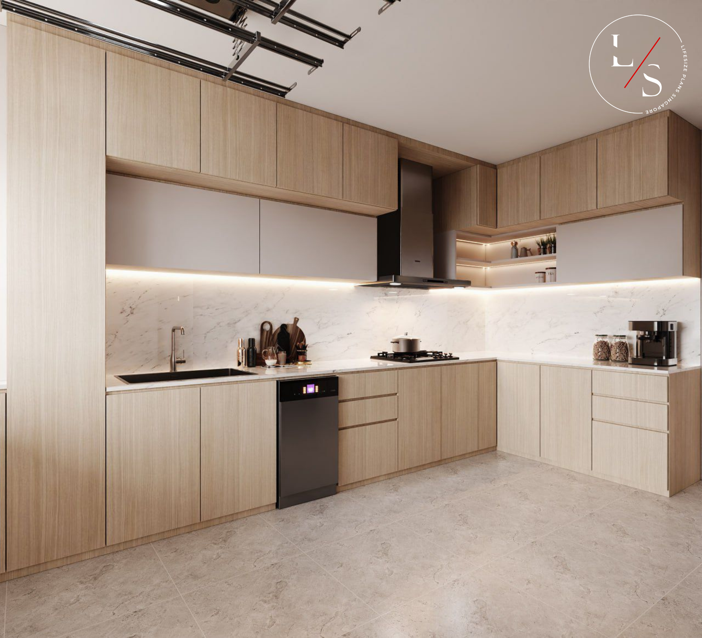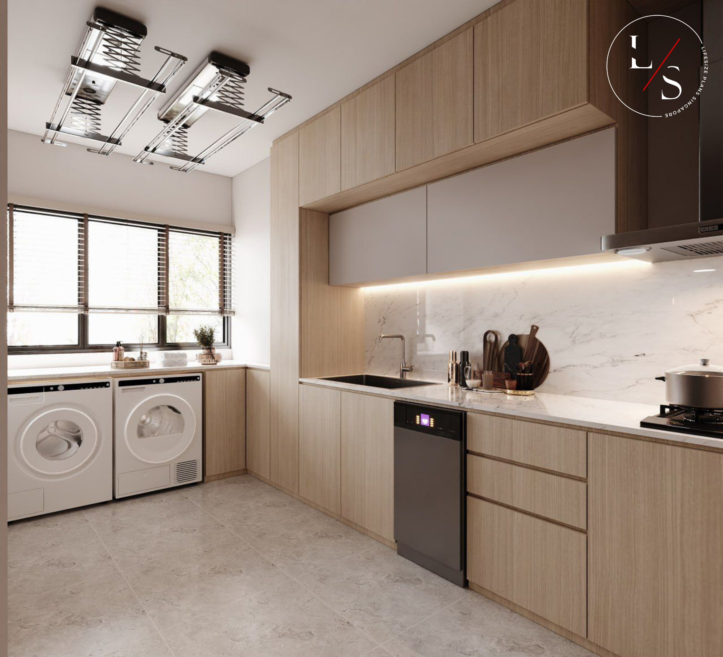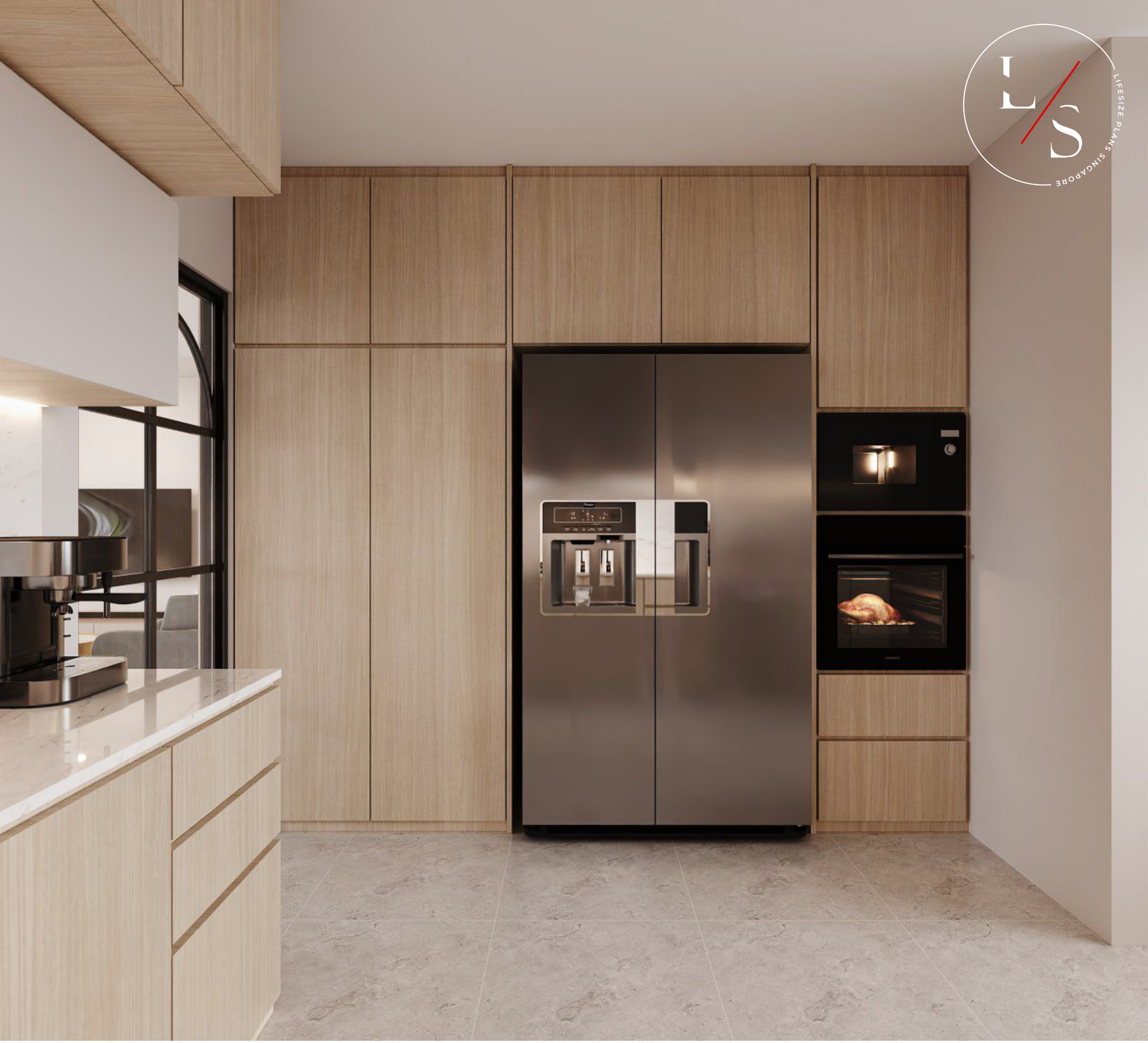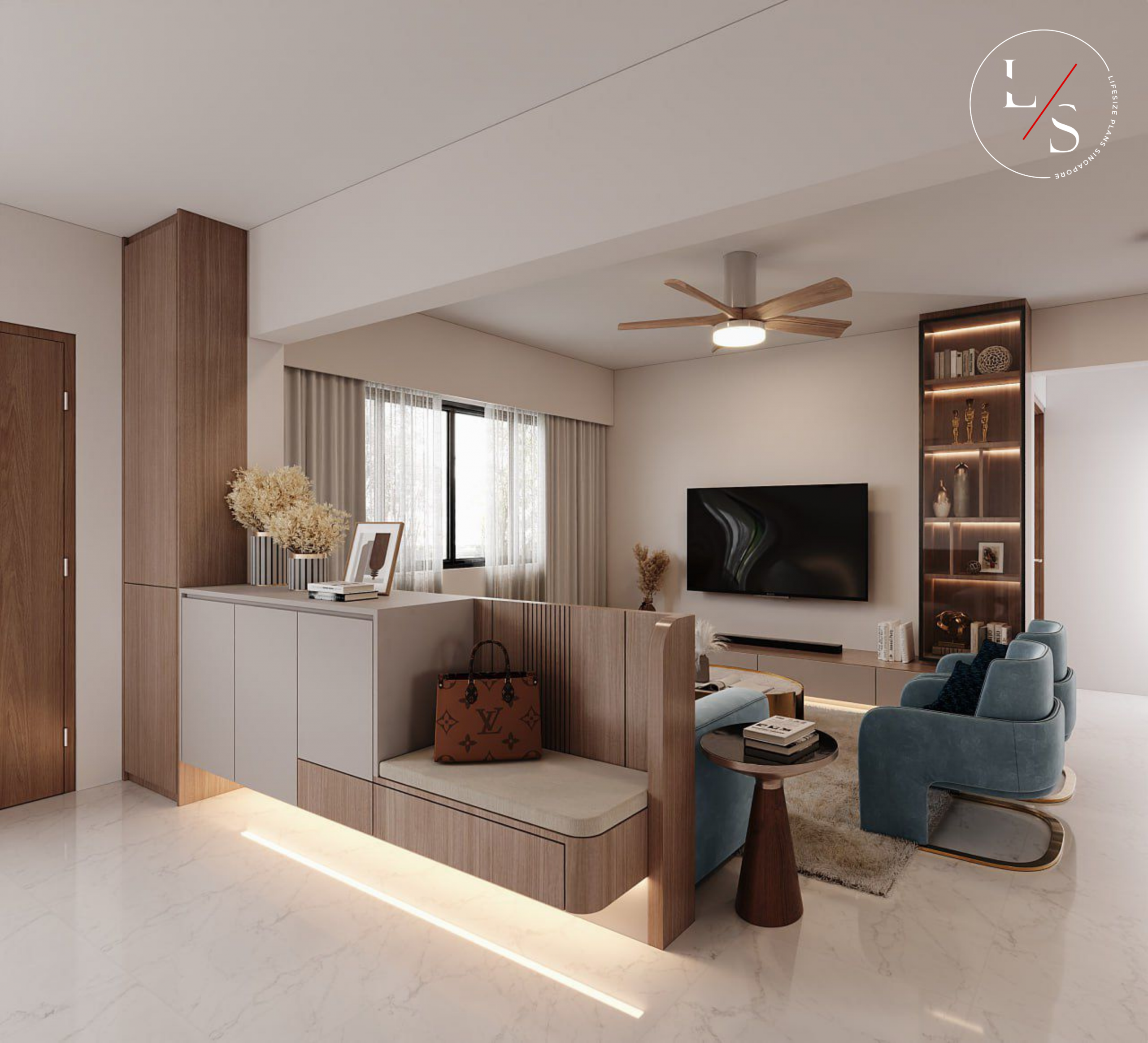 This home brings warmth and modern sophistication through its meticulously crafted carpentry and soft, neutral palette. The entry divider bench serves as both a functional seating area and a visual transition into the living room, highlighted by gentle under-cabinet lighting that adds depth and elegance.