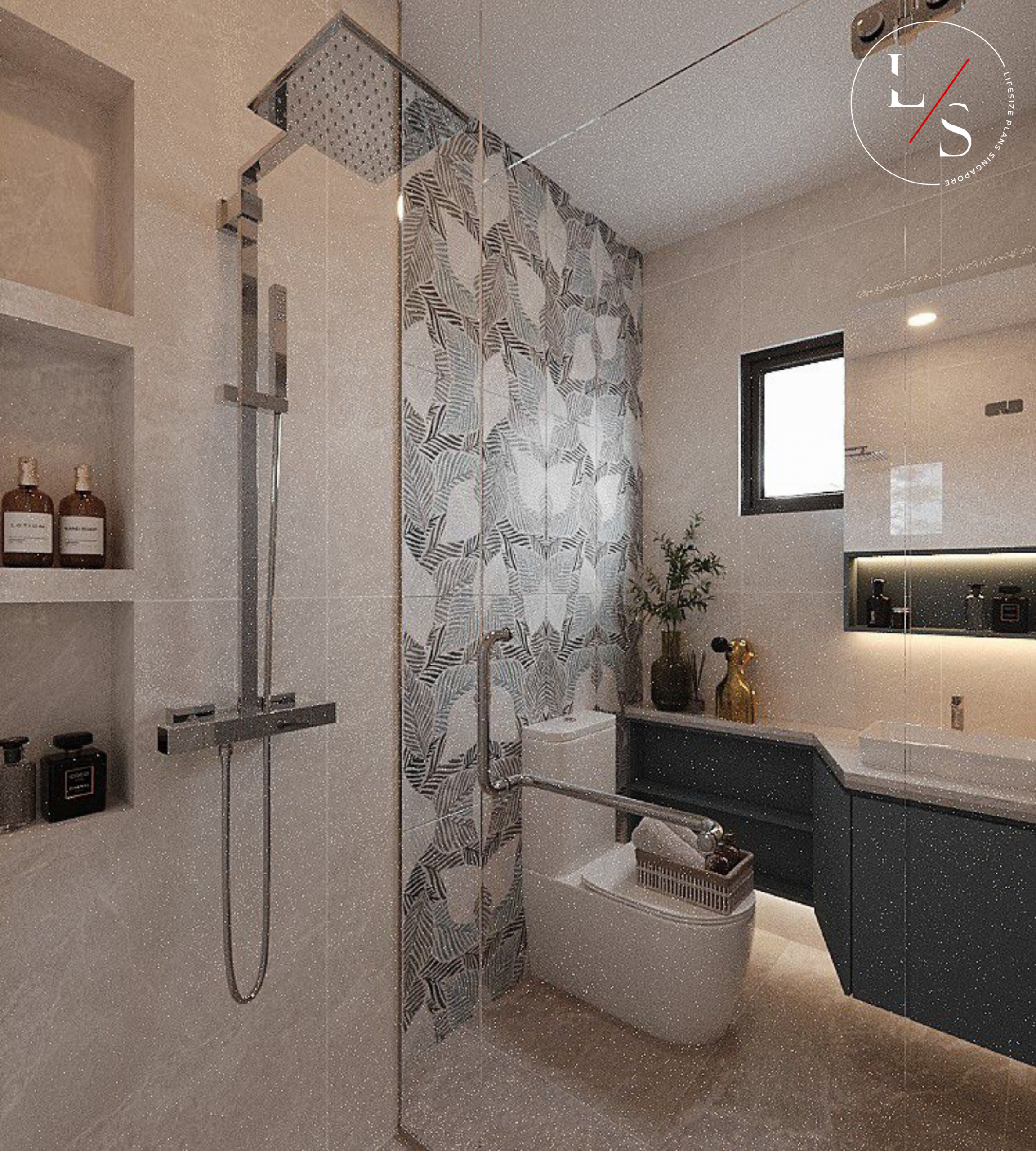The TV feature wall maintains a sleek, minimalist aesthetic, complemented by a tall illuminated display shelving unit that adds architectural interest. The mix of warm wood, soft grey cabinetry, and subtle lighting creates a space that feels welcoming yet refined.