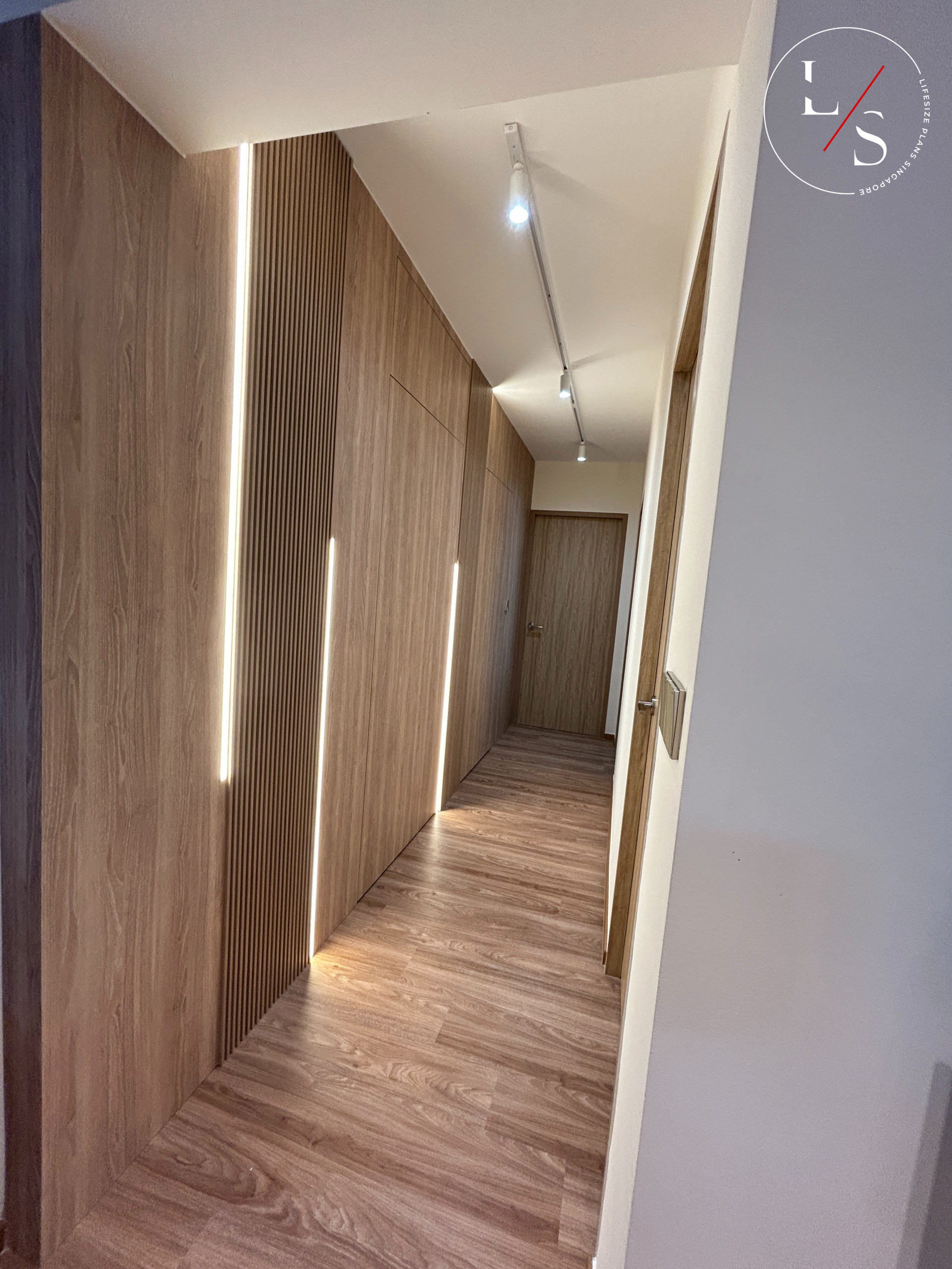 The TV feature wall maintains a sleek, minimalist aesthetic, complemented by a tall illuminated display shelving unit that adds architectural interest. The mix of warm wood, soft grey cabinetry, and subtle lighting creates a space that feels welcoming yet refined.