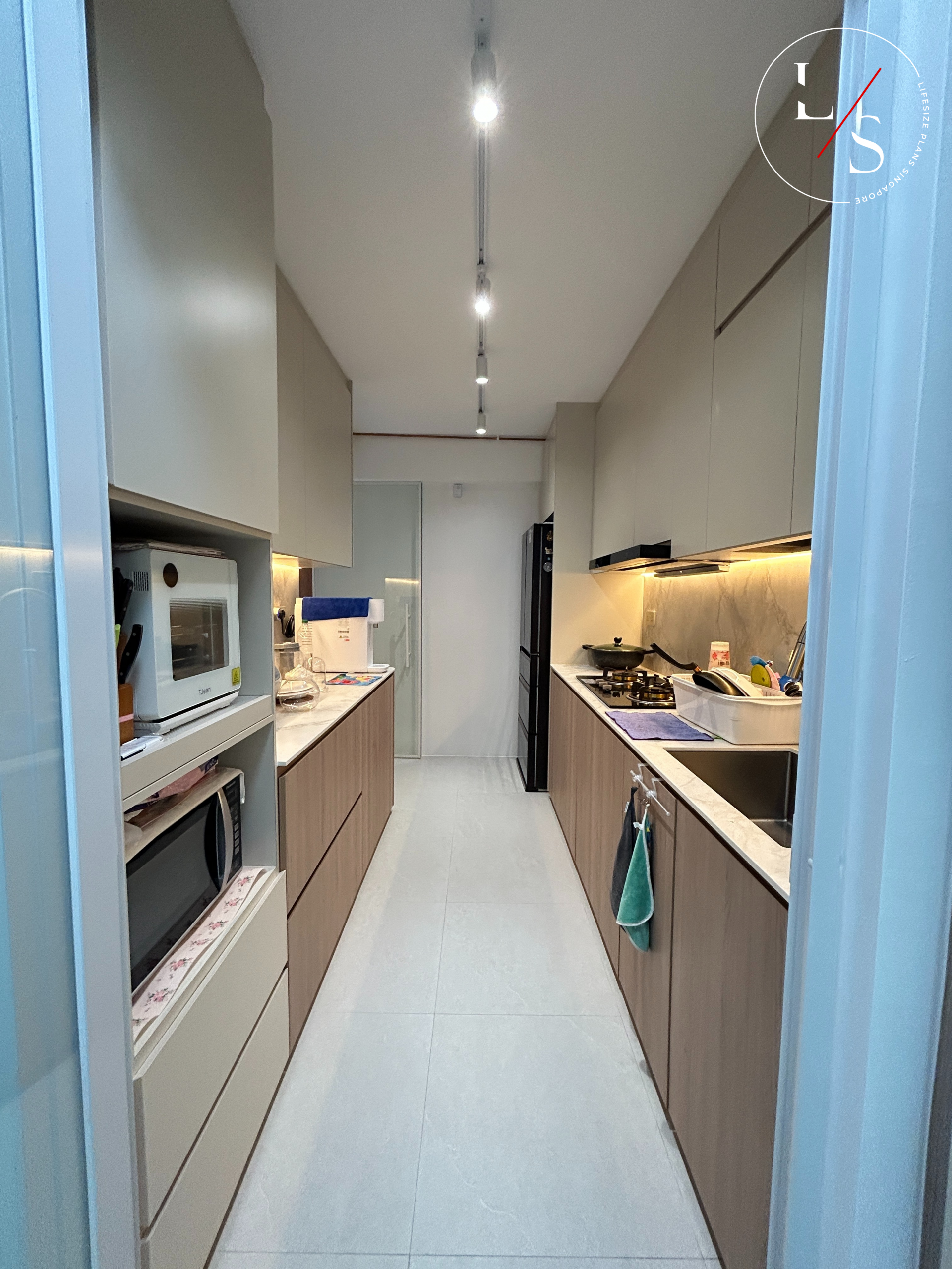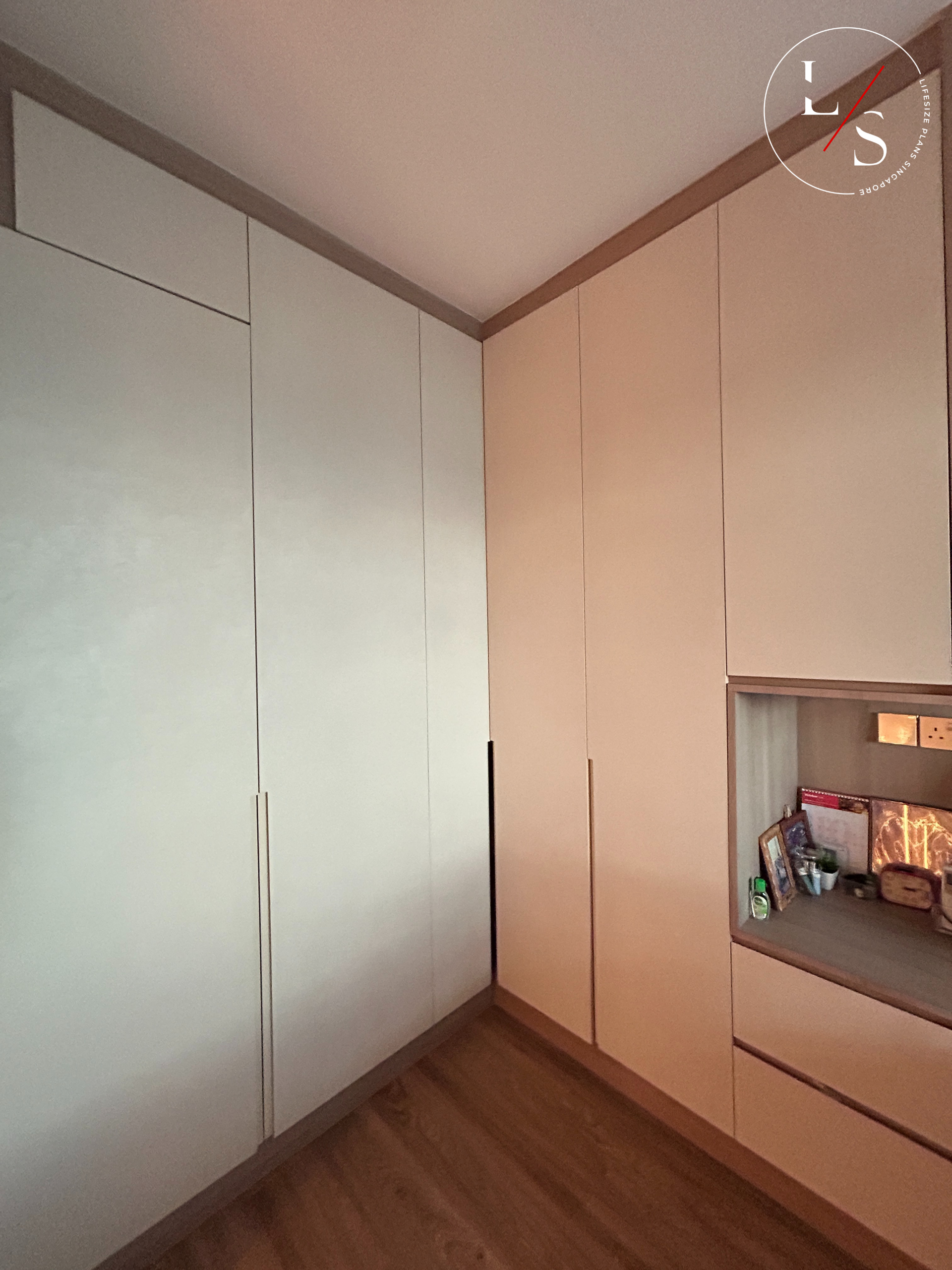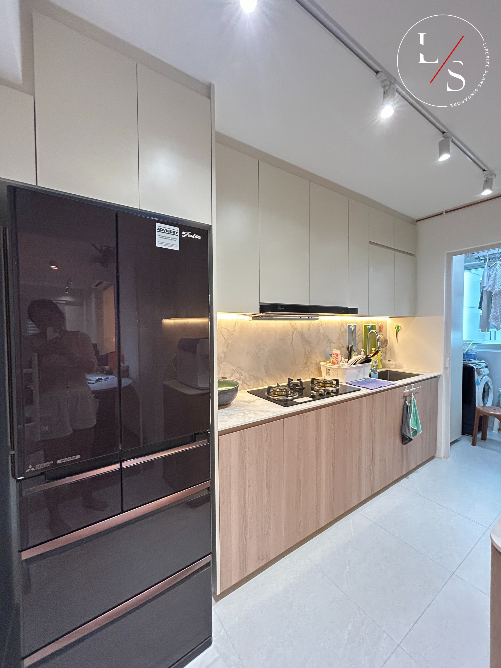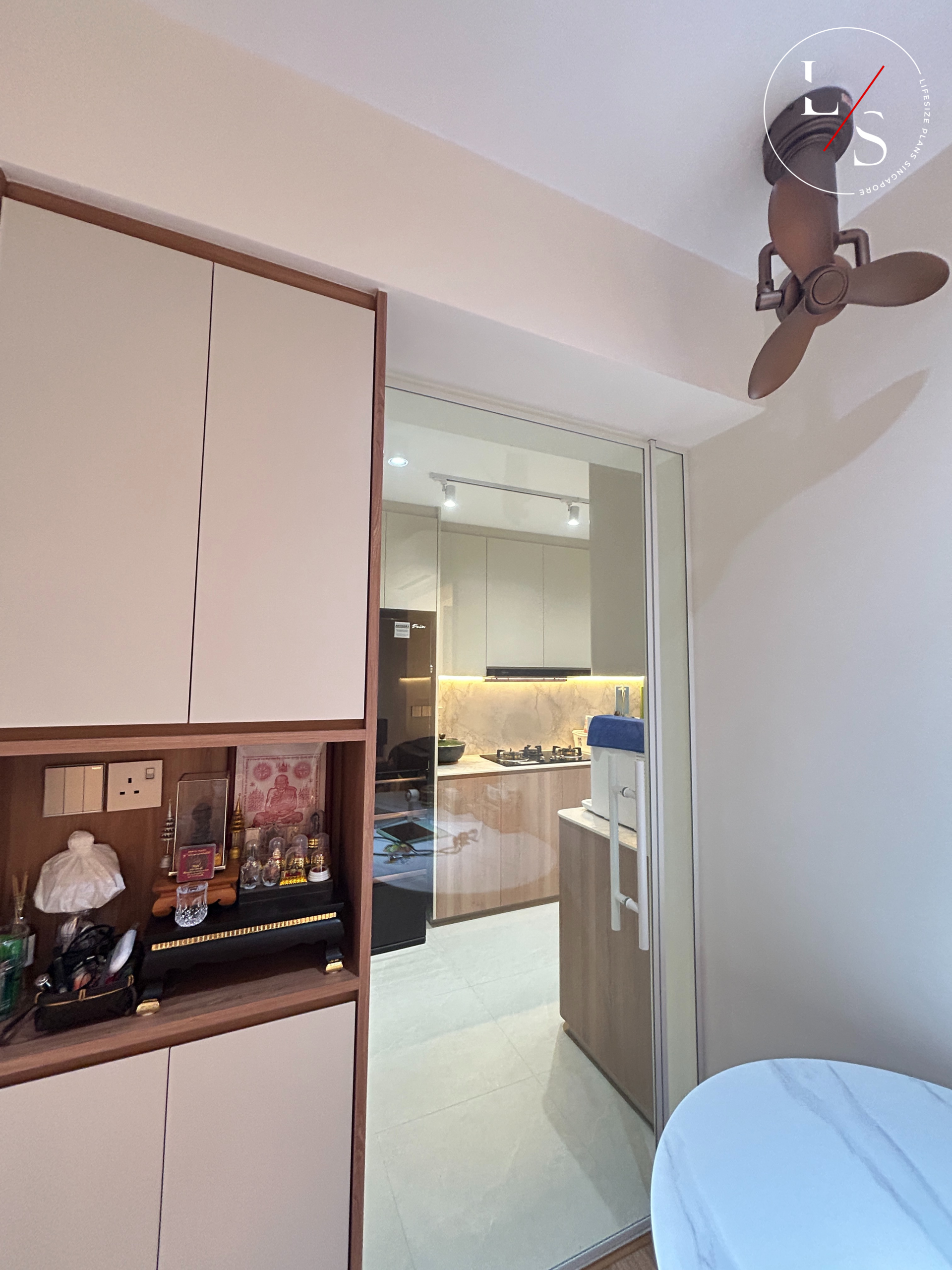 This home brings warmth and modern sophistication through its meticulously crafted carpentry and soft, neutral palette. The entry divider bench serves as both a functional seating area and a visual transition into the living room, highlighted by gentle under-cabinet lighting that adds depth and elegance.